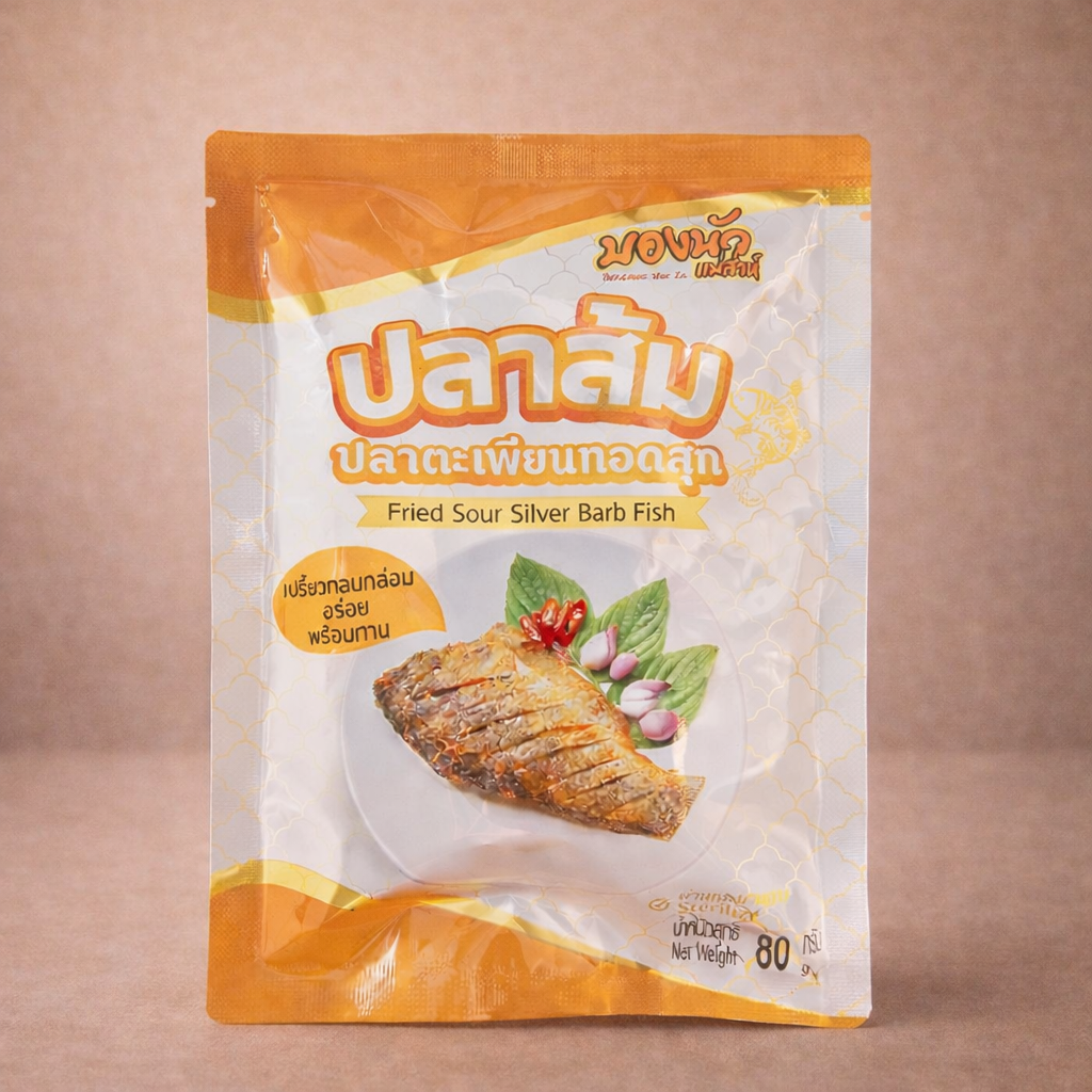 ปลาส้มทอดสุกพร้อมทานปลาตะเพียนอร่อยเปรี้ยวกลมกล่อมหมักด้วยกรรมวิธีโบราณผ่านกระบวนการฆ่าเชื้อสเตอริไรส์จึงเก็บได้นานบรรจุซองละ 85 กรัมเก็บได้โดยไม่แช่เย็นและไม่โดนแสงแดด